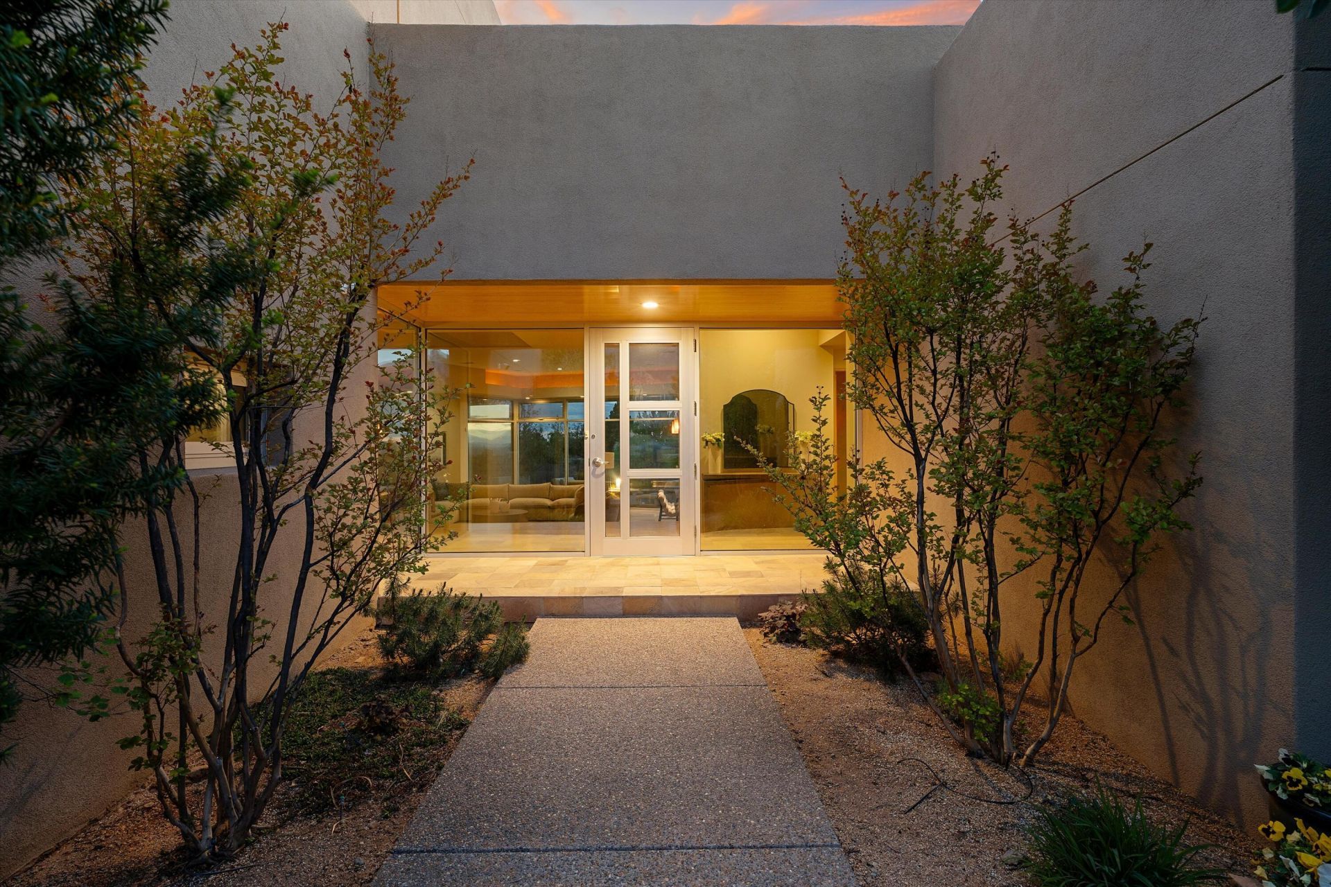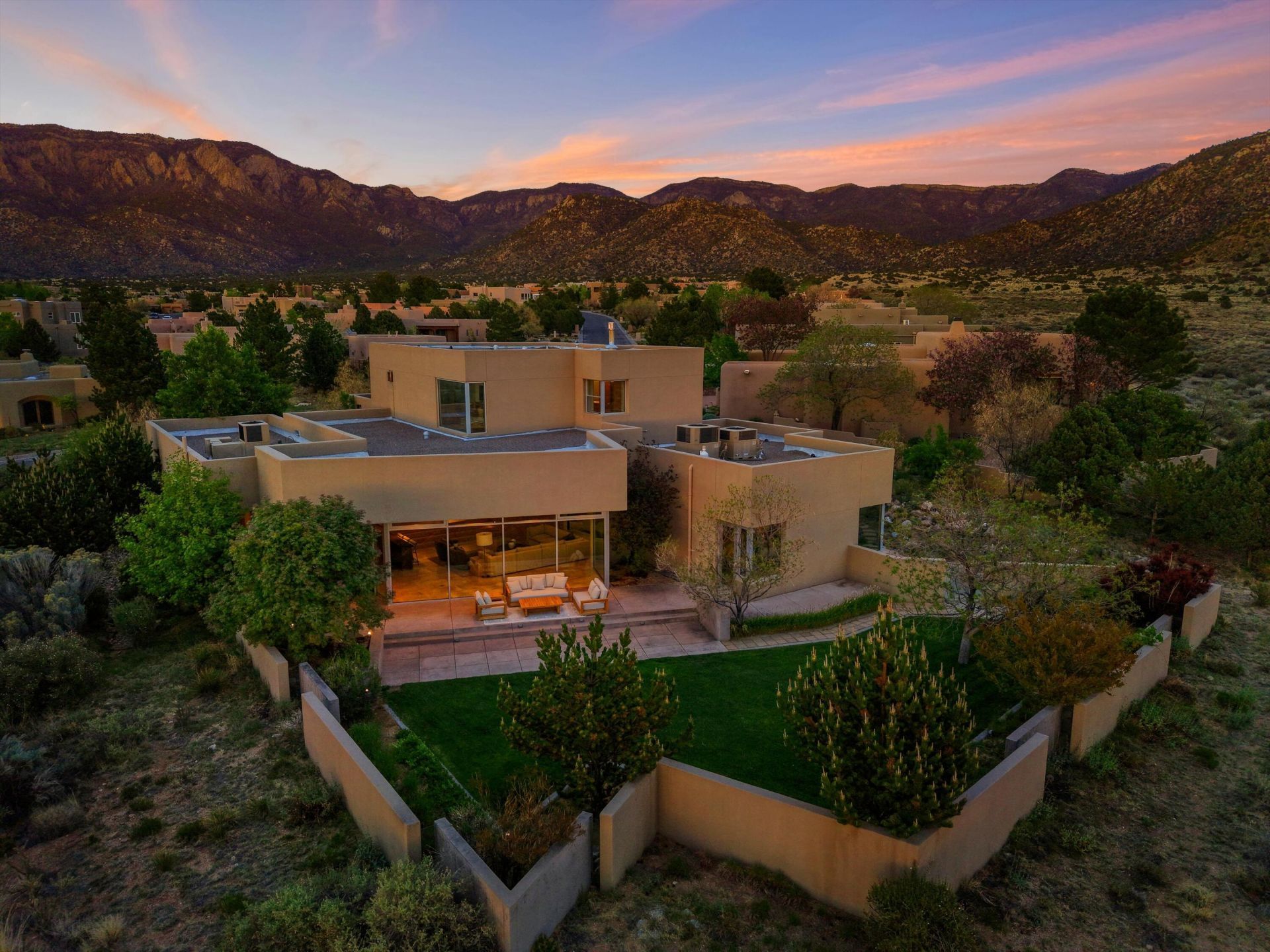Welcome to this beautiful contemporary home in the highly desirable High Desert community. Thoughtfully designed to capture incredible views of the city lights and Sandia Mountains, this home features expansive storefront windows, wood flooring, porcelain tile, stunning cabinetry, and rich granite countertops throughout. The versatile floor plan offers 5 bedrooms, including a spacious primary suite with a walk-in closet and a spa-inspired bath. Enjoy a dedicated theater room, a wet bar in the family room, and a temperature-controlled wine cellar--perfect for entertaining. Located just minutes from scenic hiking trails, this home offers the perfect blend of comfort, style, and outdoor living.